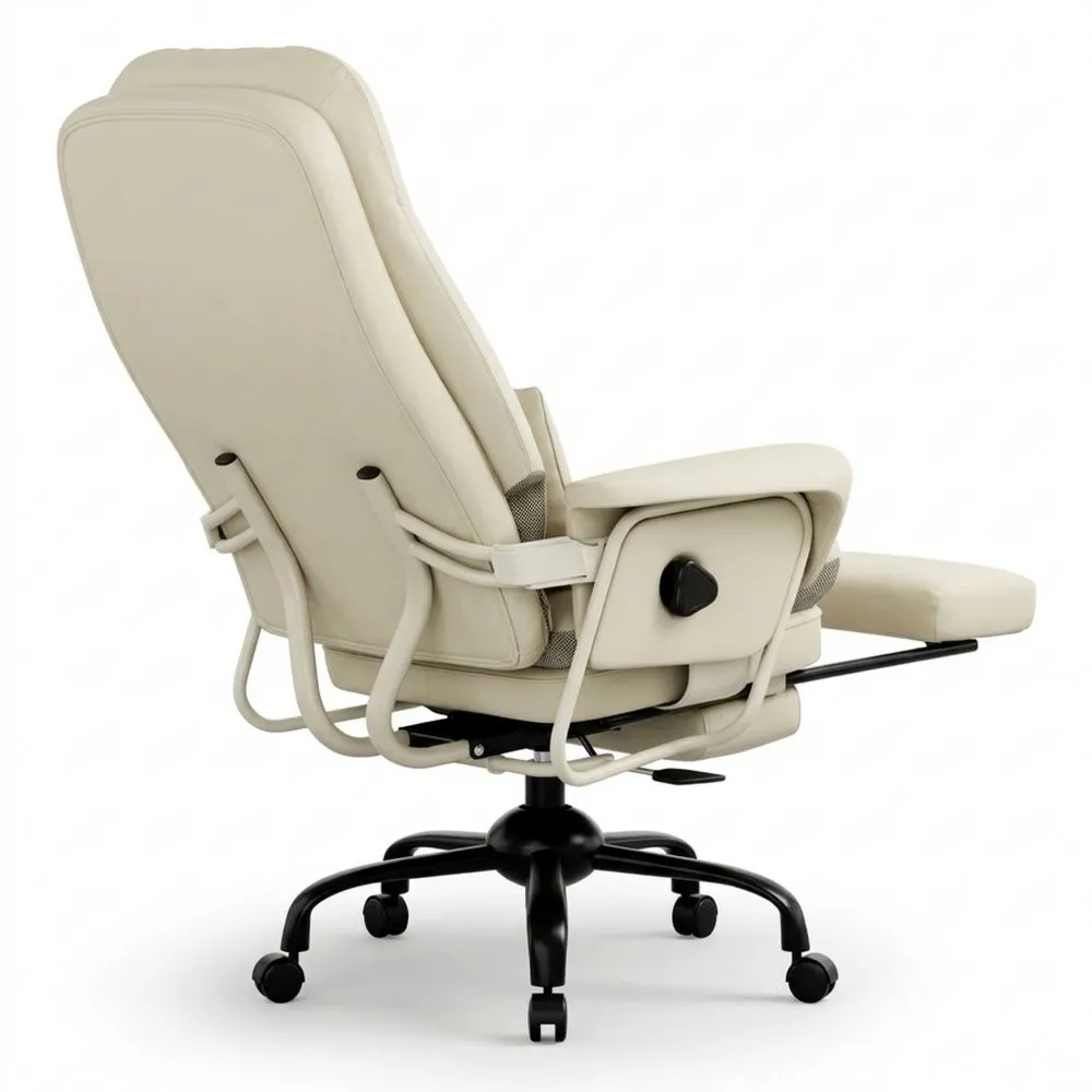 Dieser Stuhl kombiniert die Funktionen Arbeiten, Entspannen und Pausieren. Er passt sowohl ins Büro als auch ins Homeoffice. Das PU-Leder bietet eine angenehme Oberfläche, während der Sitzkomfort unterstützt. Die Rückenlehne lässt sich bis zu 160 Grad neigen, geeignet für Arbeit, Lesen oder kurze Pausen. Der Stuhl verfügt über eine gut gepolsterte Sitzfläche und ein separat nutzbares Lendenkissen unterstützt die Taille. Seitliche Mesh-Einsätze fördern die Luftzirkulation. Eine integrierte, ausziehbare Fußstütze ermöglicht eine fast liegende Position für Pausen. Die Sitzhöhe kann einfach an die Körpergröße und Tischhöhe angepasst werden, um eine natürliche Sitzhaltung zu unterstützen.