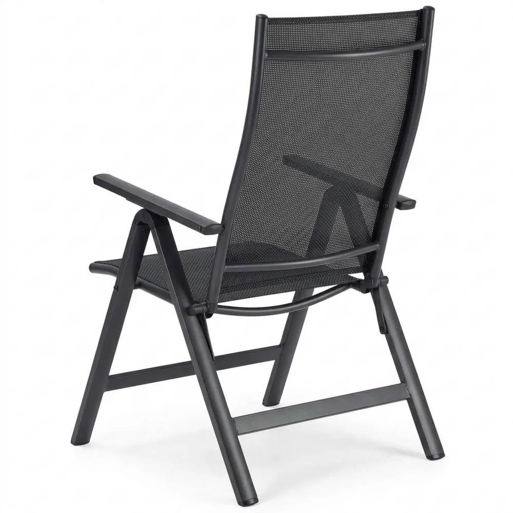 Robuster Relaxsessel mit verstellbarer Rückenlehne. Sitz- und Rückenfläche aus wetterfestem Textilene. Aluminiumgestell mit Polyesterbeschichtung, klappbar.
