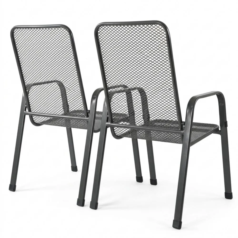 Die Streckmetall-Stapelstühle sind geeignet für Innen- und Außenbereiche einschließlich Outdoor-Gastronomie. Die Stühle bestehen aus pulverbeschichtetem Stahlrohr und sind wetterbeständig. Sie verfügen über eine Rückenlehne und Armlehnen. Die Sitzhöhe beträgt etwa 40 cm und die Gesamthöhe 96 cm. Die Stühle haben eine Gewichtskapazität von 120 kg.
