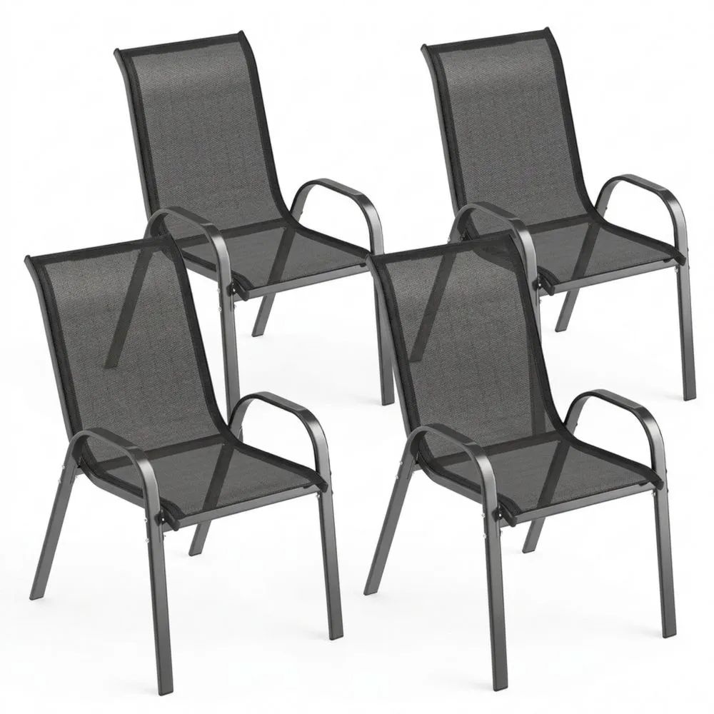 Set mit 4 Stück: Diese Outdoor-Gartenstühle bieten eine Möglichkeit, sich zu entspannen oder Mahlzeiten im Freien zu genießen. Das praktische Design ermöglicht einfaches Stapeln und Verstauen, ideal für kleinere Außenbereiche. Das Netzgewebe sorgt für Atmungsaktivität und Komfort. Ergonomische Armlehnen und eine geneigte Rückenlehne bieten Unterstützung. Die Stühle bestehen aus einem Stahlrahmen mit Pulverbeschichtung, um wetterbeständig zu sein. Rutschfeste Füße verhindern Kratzer auf dem Boden. Abmessungen: Gesamtgröße: 54B x 71T x 93H cm. Gestapelte Größe: 54B x 75T x 104H cm. Sitzgröße: 44,5B x 45T cm. Belastbarkeit: 120 kg.