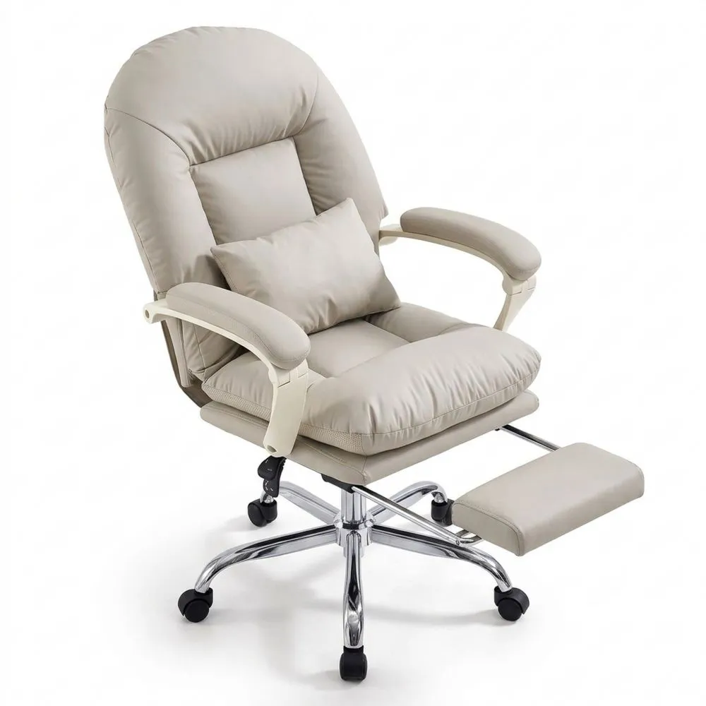 Verstellbarer ergonomischer Bürostuhl mit Fußstütze, Moderner Komfortstuhl aus PU-Leder, Bequemer Schreibtischstuhl mit Rollen, Belastbar bis 150 kg, Beige